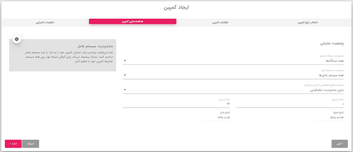 در یکتانت شما میتوانید تبلیغ خود را بر اساس نوع دستگاههای نمایش (دسکتاپ، موبایل، اندروید و IOS)، تاریخ و ساعت شروع و پایان هر تبلیغ، استانهای کشور و اپراتورهای اینترنتی نمایش دهید.