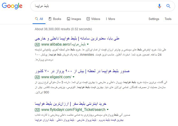 بهترین و قدرتمندترین تبلیغات در جستجو، گوگل ادز است. احتمالاً بارها مشابه تبلیغات زیر را در صفحۀ نتایج گوگل دیده باشید. نتایجی که با علامت AD مشخص میشوند در واقع نتایج پولی (Paid Search) هستند.