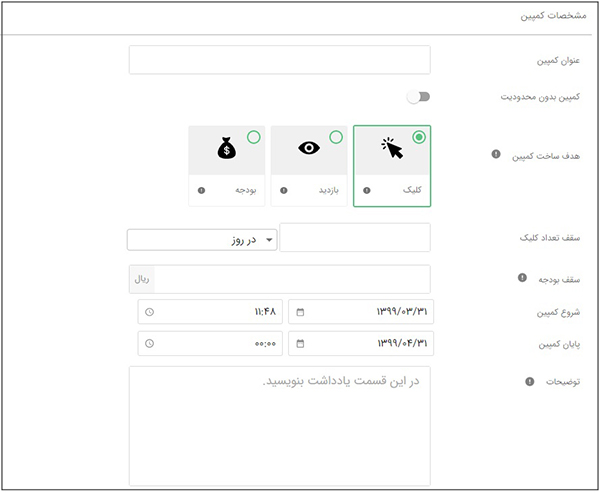 - برای کمپینهای بنری، حداقل 480 تومان به ازای هر کلیک است
